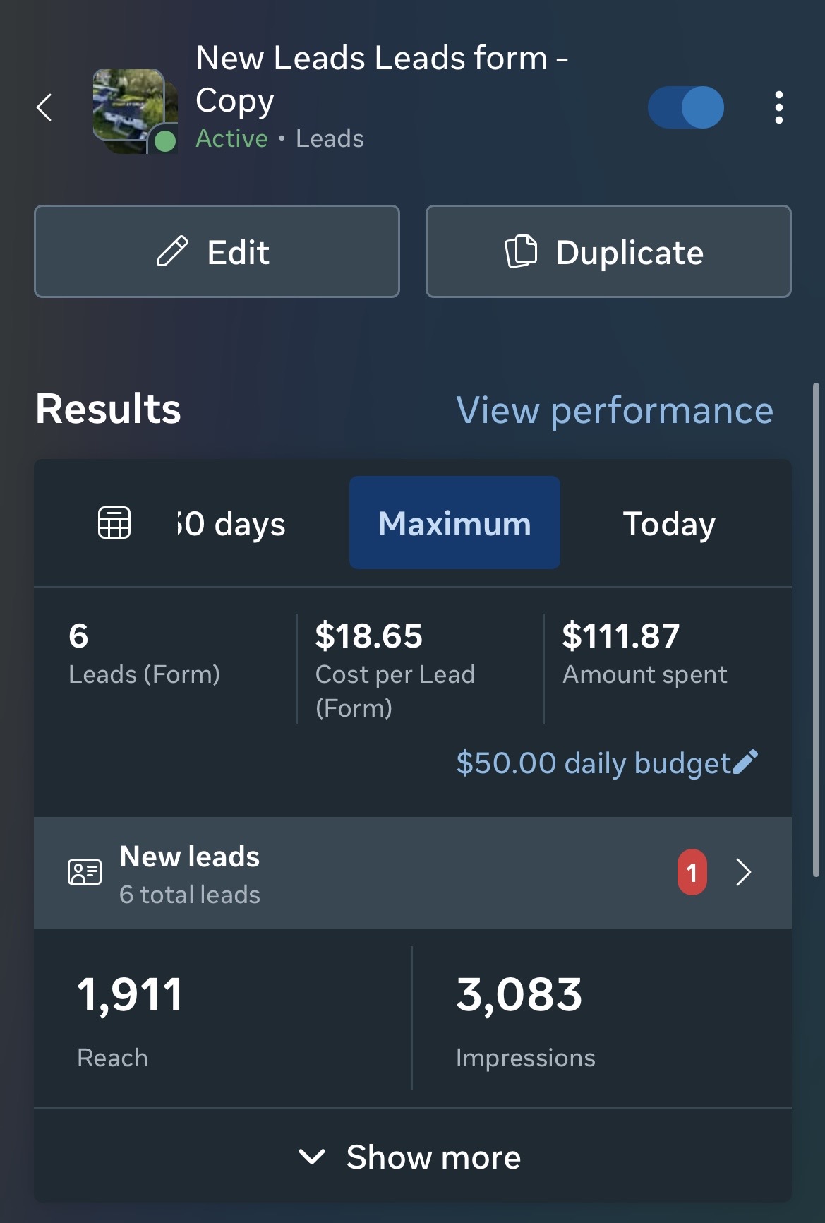 Generated 6 qualified storm damage leads at $18.65 per lead within the first 2 days of campaign launch.